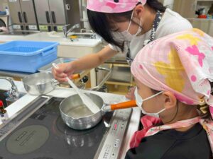本イベントは、「子ども料理教室」と「大人向けエクササイズ」を組み合わせたプログラムで構成され、健康スポーツ学科の学生が子どもたちの料理教室のサポートを行いました。