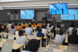 2025年8月1日(金)、現在開催中の世界水泳選手権・男子100mバタフライ予選に出場した本学職員・水沼尚輝選手を応援するため、パブリックビューイングを実施いたしました。当日は多くの学生・教職員の皆さまにご参加いただき、会場は熱い声援と拍手に包まれました。