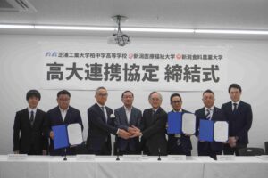 締結式には、本学および新潟食料農業大学、芝浦工業大学柏中学高等学校の関係者が出席し、今後の高大連携への期待が述べられました。