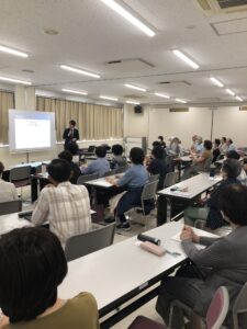 講座では、視覚情報が後頭葉で感覚されることを例示し、視覚は眼球から脳までが関与するということ、さらに適切な眼鏡の使用が脳神経活動の活性化・ストレス軽減・リラックス・脳血流量の増加に効果的であるということも詳しく紹介しました。さらに、眼科での眼鏡度数決定 (処方箋発行)、眼鏡店での眼鏡選び、眼鏡の使用・保管など、関連する場面での留意点について説明しました。