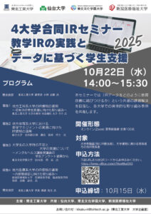 10月22日(水)に東北工業大学主催、本学、仙台大学、東北文化学園大学共催の「4大学合同IRセミナー」を開催します。
