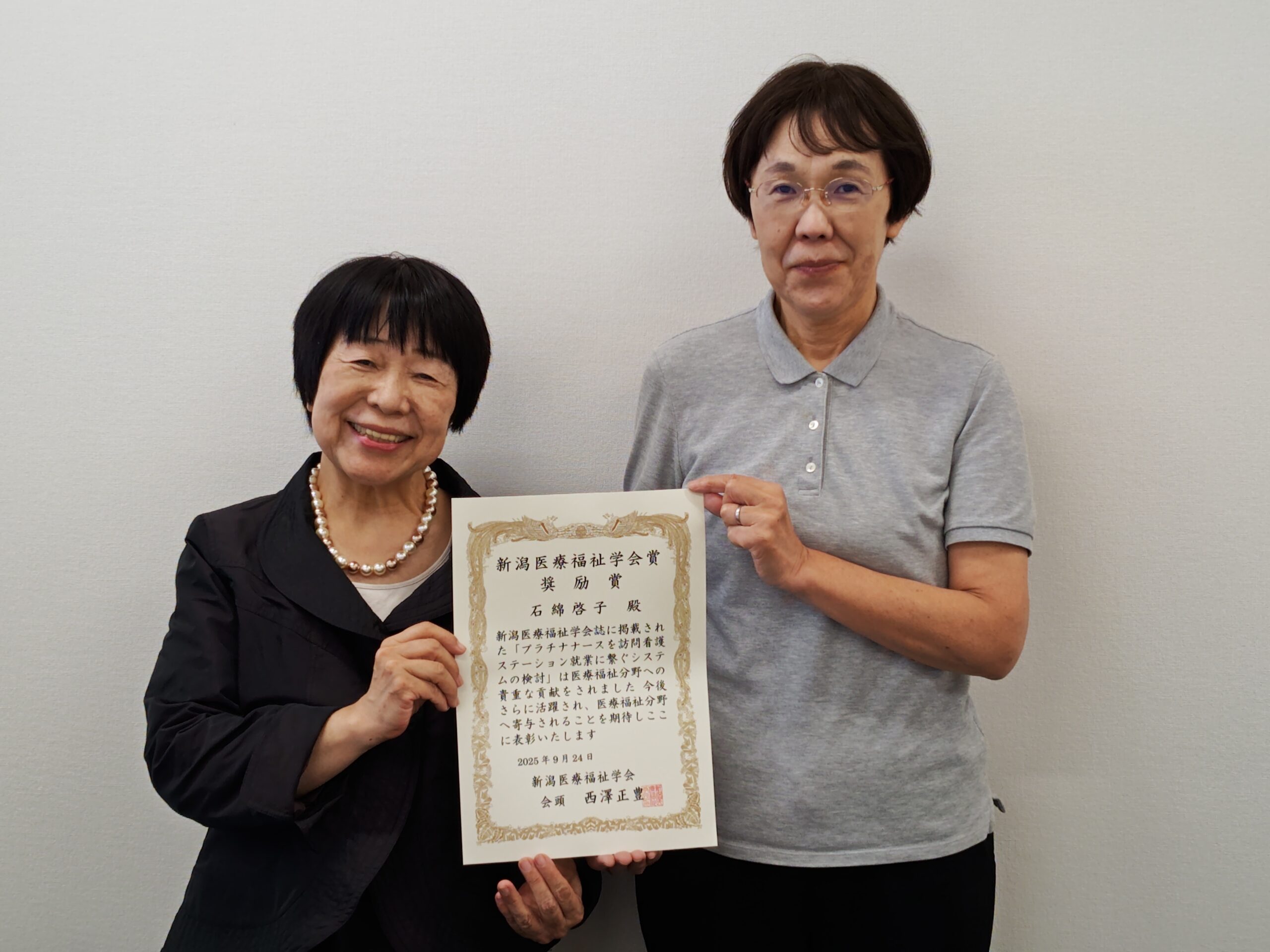 2024年度に本学大学院博士課程を修了された石綿啓子さんの学位論文「プラチナナースを訪問看護ステーション就業に繋ぐシステムの検討」が新潟医療福祉学会 奨励賞を受賞しました。