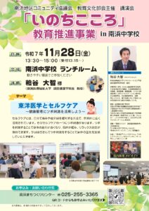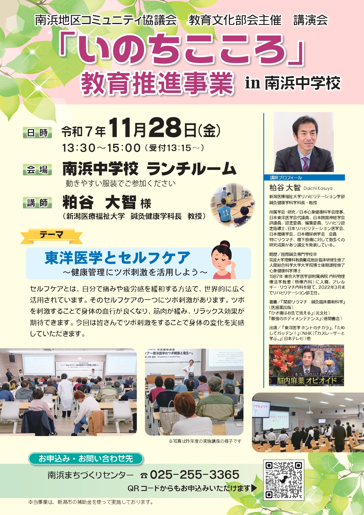 鍼灸健康学科は、2025年11月28日(金)、南浜地区コミュニティ協議会教育文化部会主催の「いのち・こころ」教育推進事業in南浜中学校に参加し、