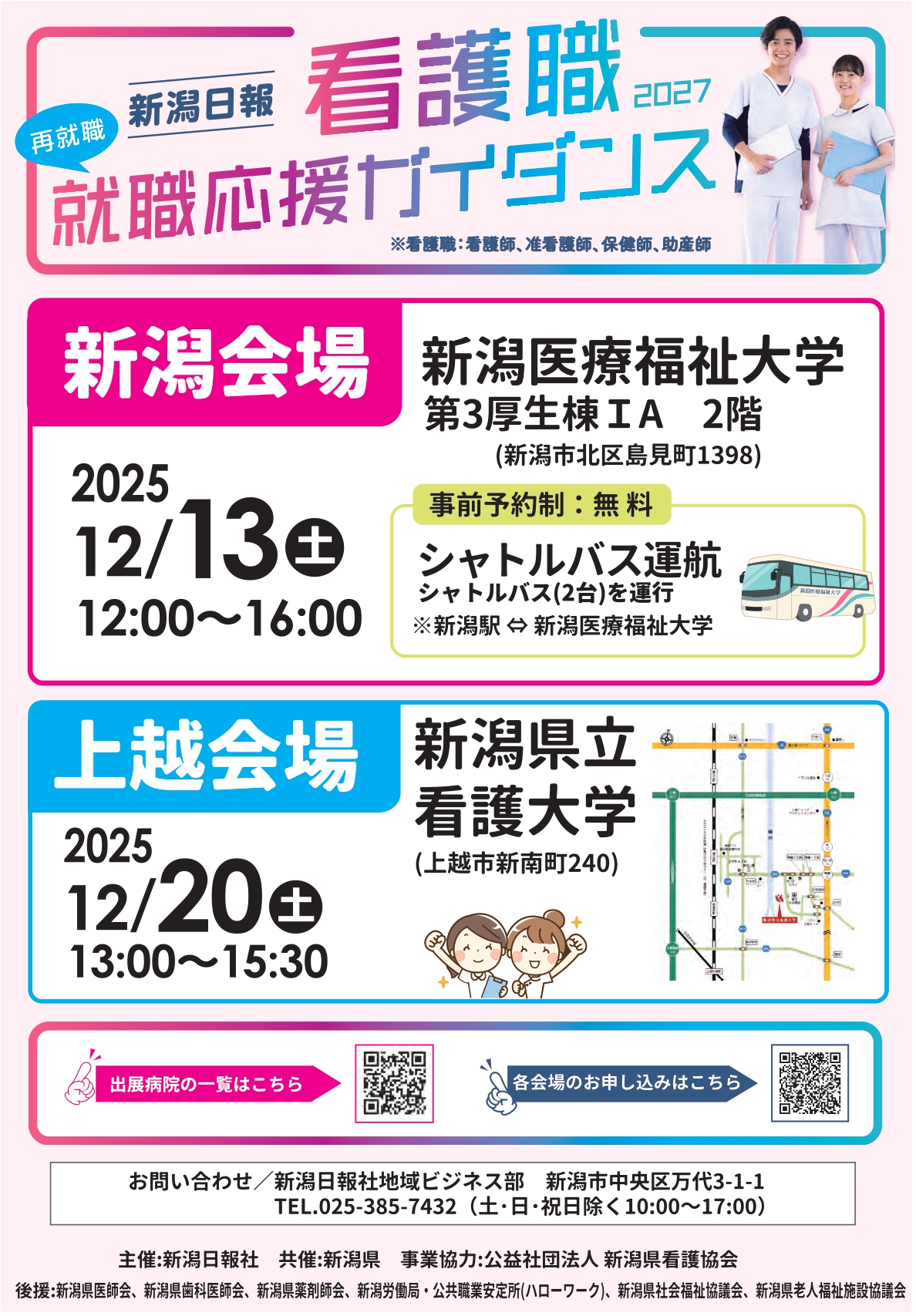 看護職を目指す方を対象とした「新潟日報 看護職就職・再就職応援ガイダンス2027」が、本学および新潟県立看護大学を会場として開催されます。