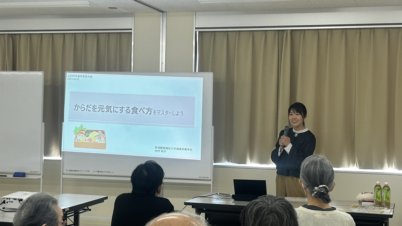 今回は健康栄養学科の中村純子先生が「からだを元気にする食べ方をマスターしよう」をテーマに講演を行いました。