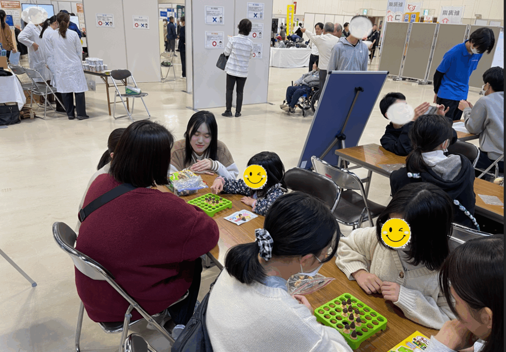 新潟市産業振興センターで開催されたフェアに参加し、「きのこの山・たけのこの里」のオセロや「たい焼き」立体パズル、車椅子体験、ツボ押し体験を来場者の方々に紹介しました。