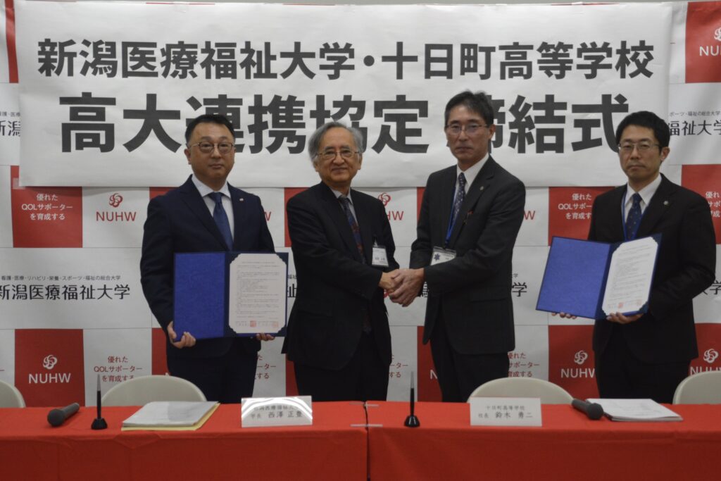 新潟医療福祉大学・矢田広視事務局長、西澤正豊学長、新潟県立十日町高等学校・鈴木勇二校長、加納直恵教頭