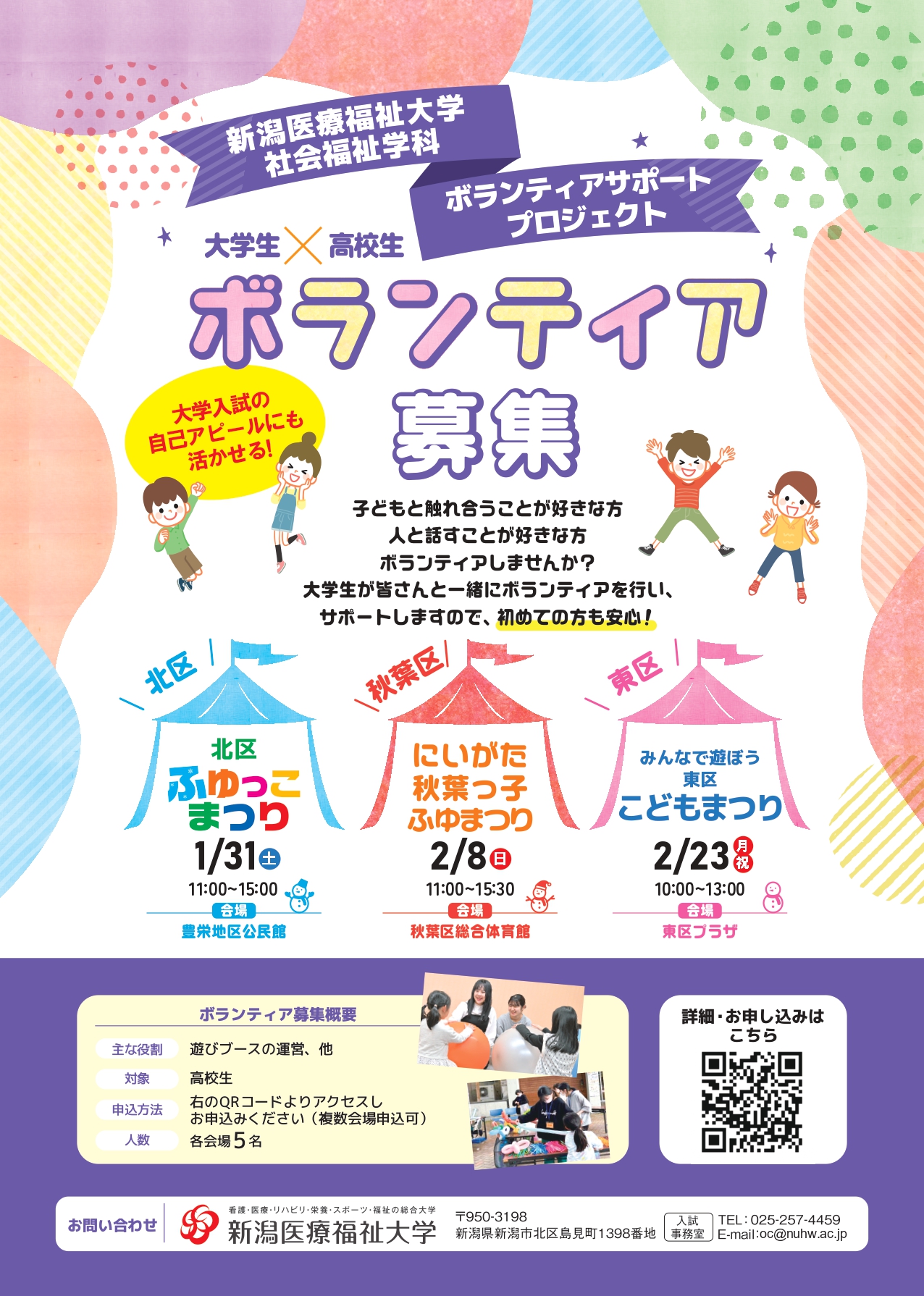 社会福祉学科では、大学生と高校生が一緒に活動する「ボランティアサポートプロジェクト」として、高校生ボランティアを募集しています。