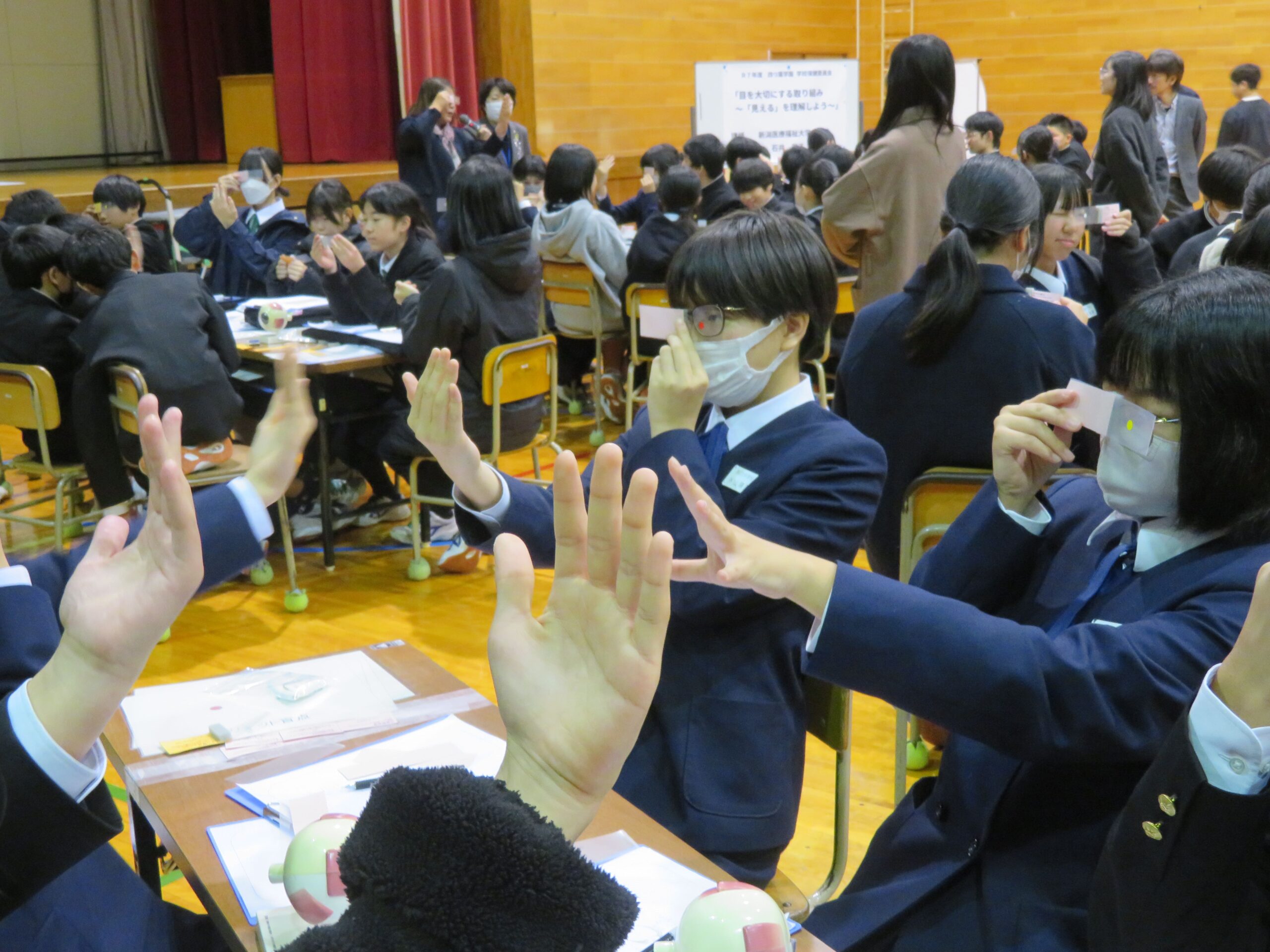 ・生徒が楽しそうに学び、真剣にメモを取っている姿が印象的でした。視覚障害のシミュレーションキットや模型を実際に手に取って体験してもらうことで、より興味を持ってもらえることを学びました。眼は一生大切にしていかなければならないものなので、小中学校の段階から講演を通してその重要性を伝えることは、とても意義のあることだと感じました。