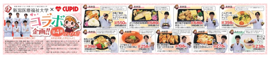 新潟医療福祉大学とCUPIDのコラボ企画、第4弾ファイナルの紹介です。 新潟市内11店舗と五泉店で販売が行われます。