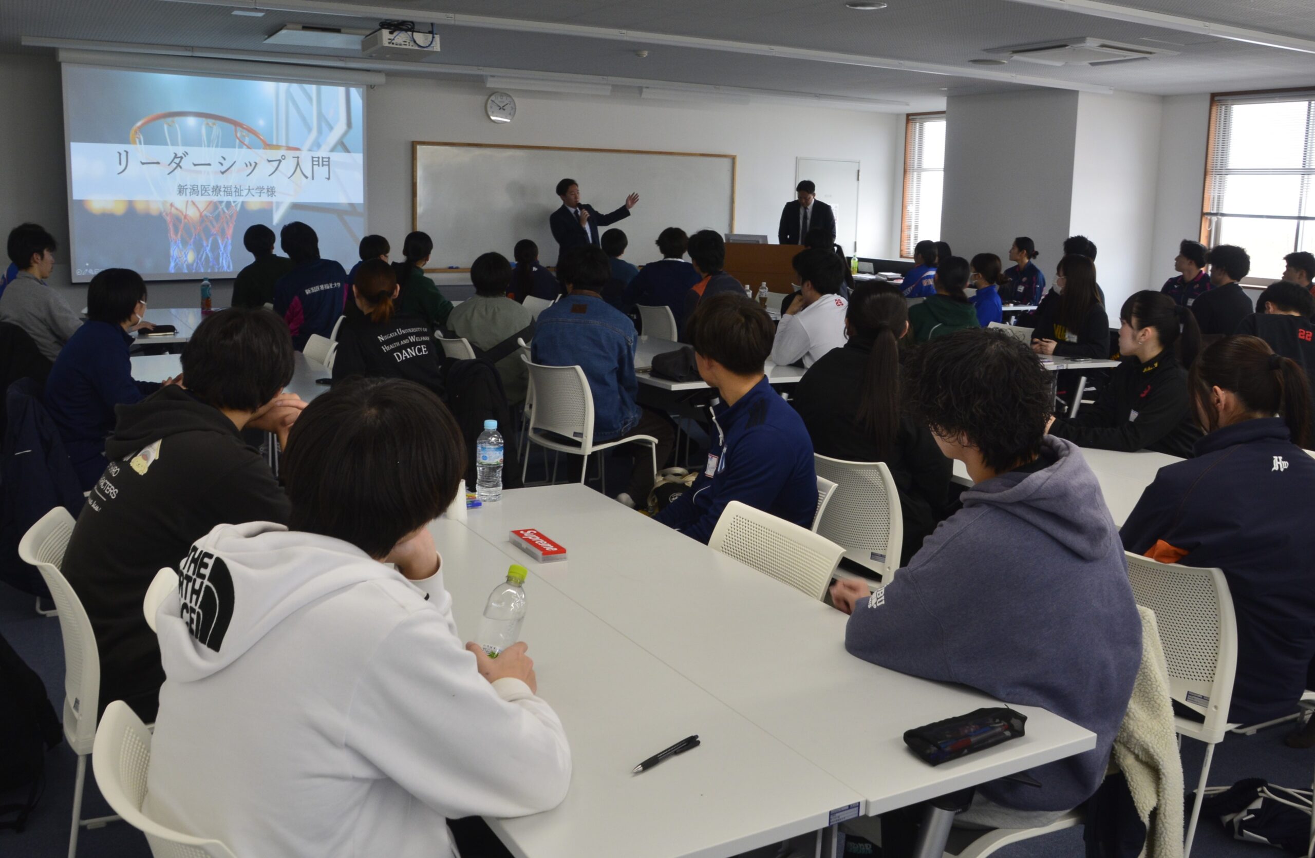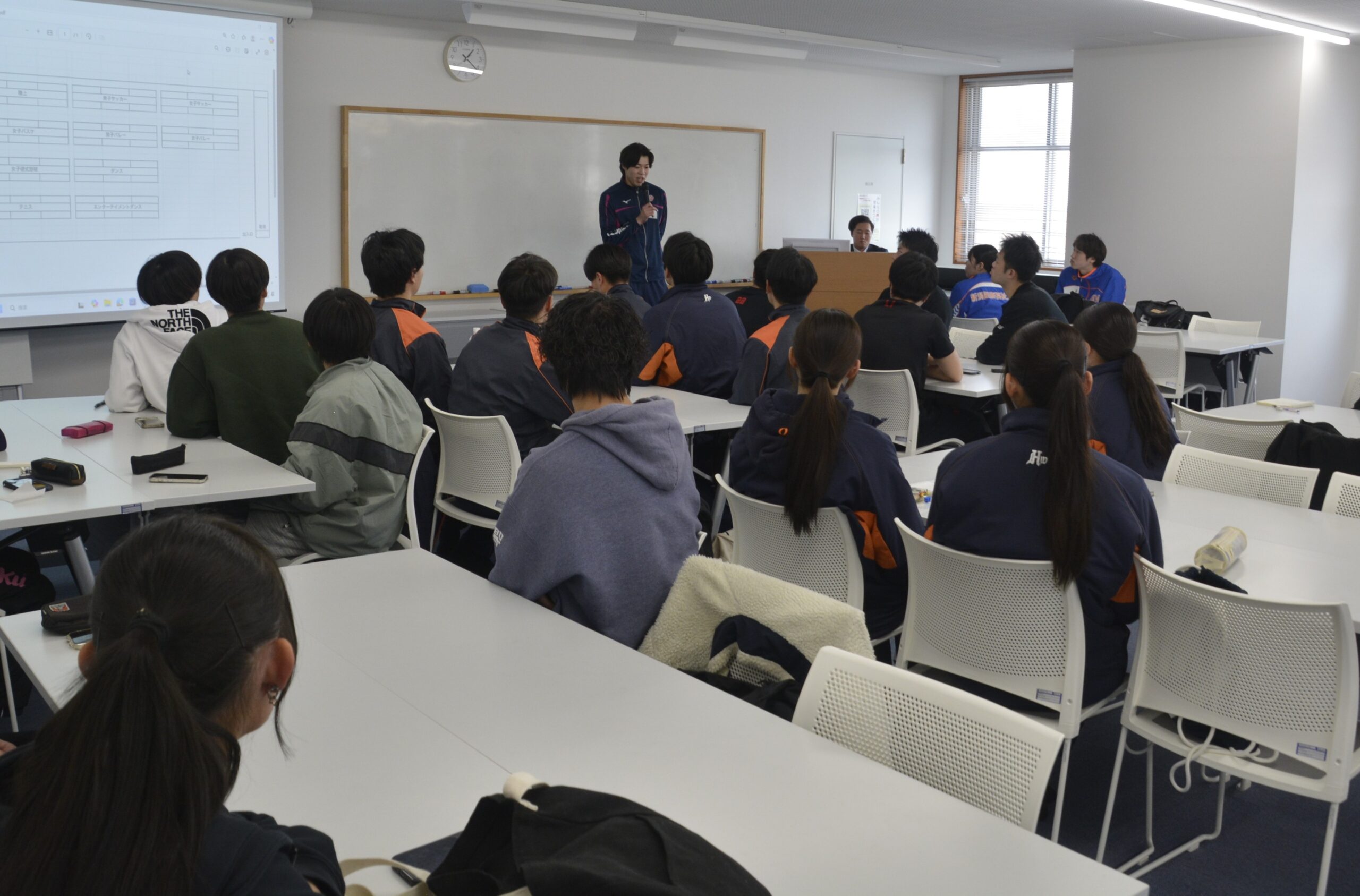 「スポーツの意義について考える」をテーマとし、競技と学業を両立するための自己規律やモチベーション向上を目的とした研修を実施しました。元日本代表選手の佐藤氏の経験をもとに、競技人生や困難を乗り越えた実体験を交えた講演が行われました。