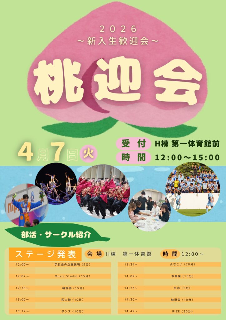 入学はしたけど「サークルに入って友達の輪を広げたい・・・」「どんなクラブサークルがあるのか知りたい・・・」などお考えの新入生のみなさん、桃迎会2026に参加して新潟医療福祉大学ならではの活動を知っていただき、新しいキャンパスライフを一緒に楽しく作りましょう!