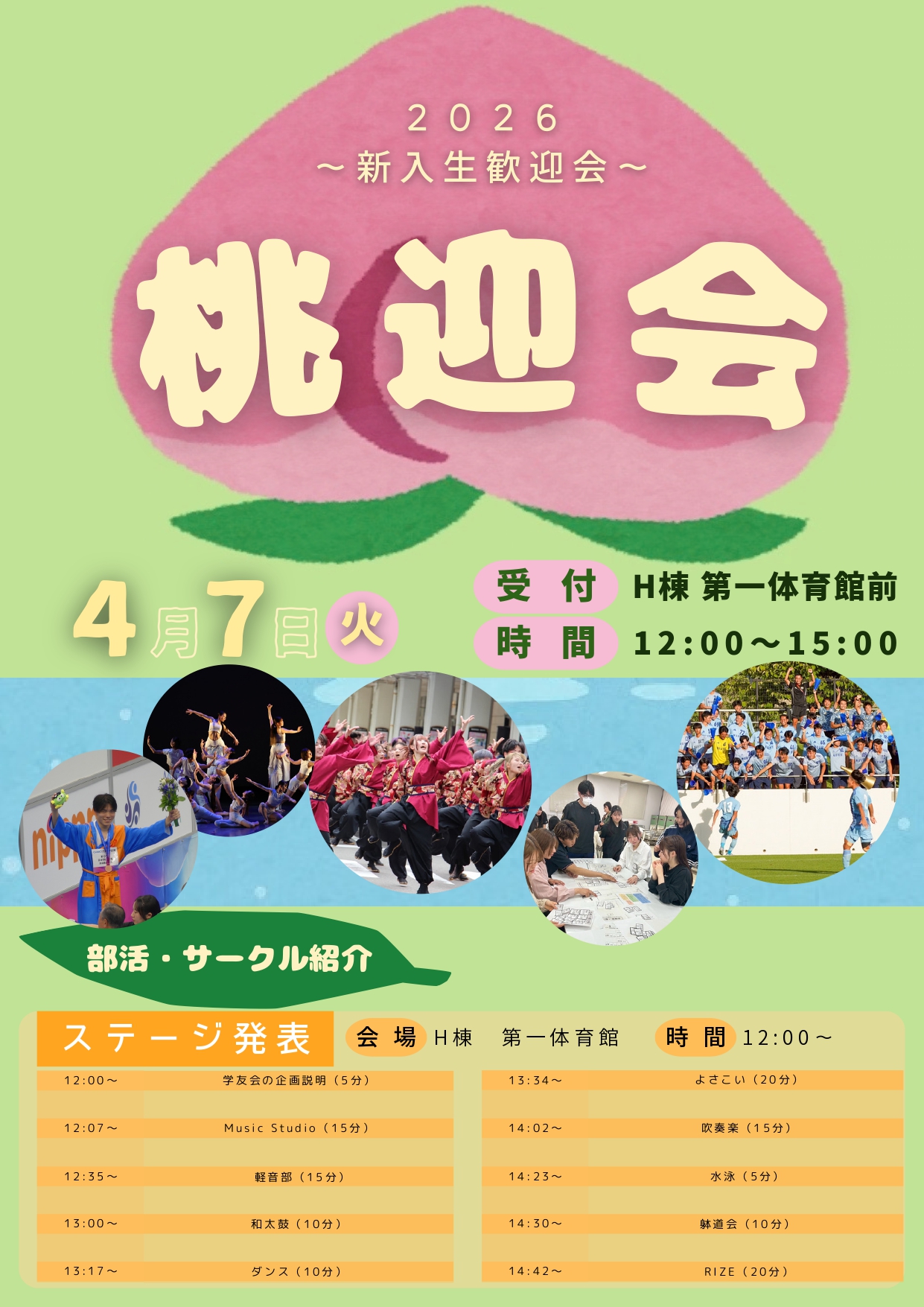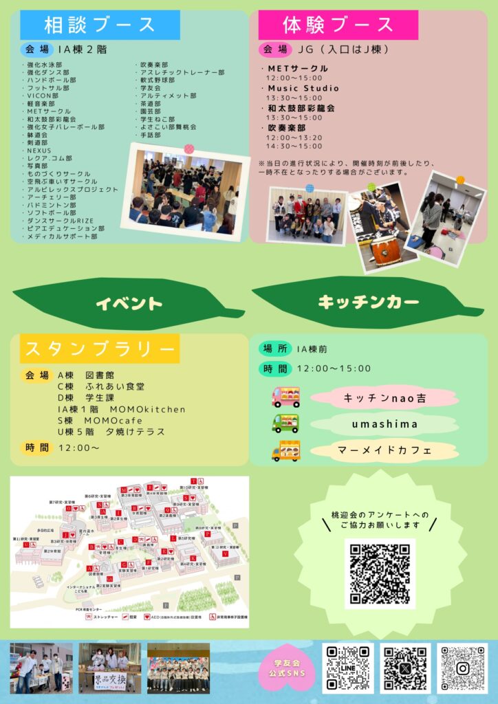桃迎会2026では、学友会公認クラブ・サークルによるステージ発表や相談・体験ブースなど、どんなクラブ・サークルに入ろうか悩んでいる方が気軽に参加できるようなイベントを企画しています!