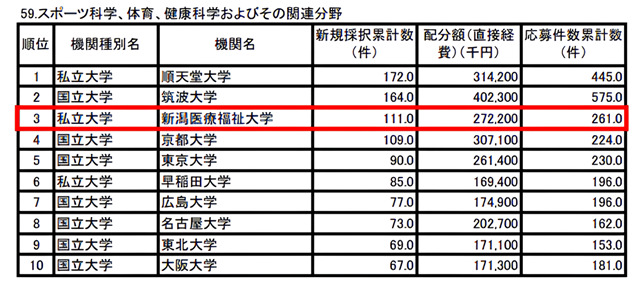 「スポーツ科学、体育、健康科学およびその関連分野」の新規採択累計数で全国第3位にランクインしました(下表詳細)。