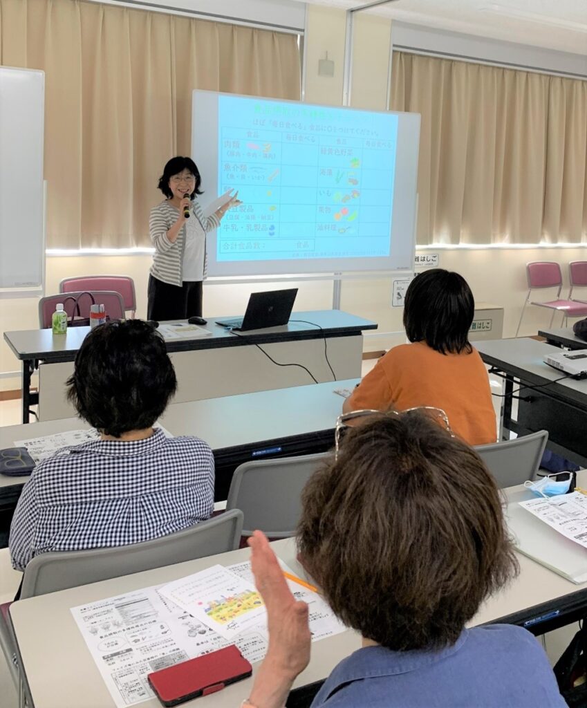 健康長寿には食事が重要であること、特に体重減少がみられる場合は、生活習慣病予防からフレイル予防の食事に切り替える必要があることなどを中心にお話しされました。適正体重の確認、指輪っかテスト、食品多様性スコアなどの自己点検には全員が熱心に参加されていました。また、災害時の食の備えについてもお話しして頂きました。