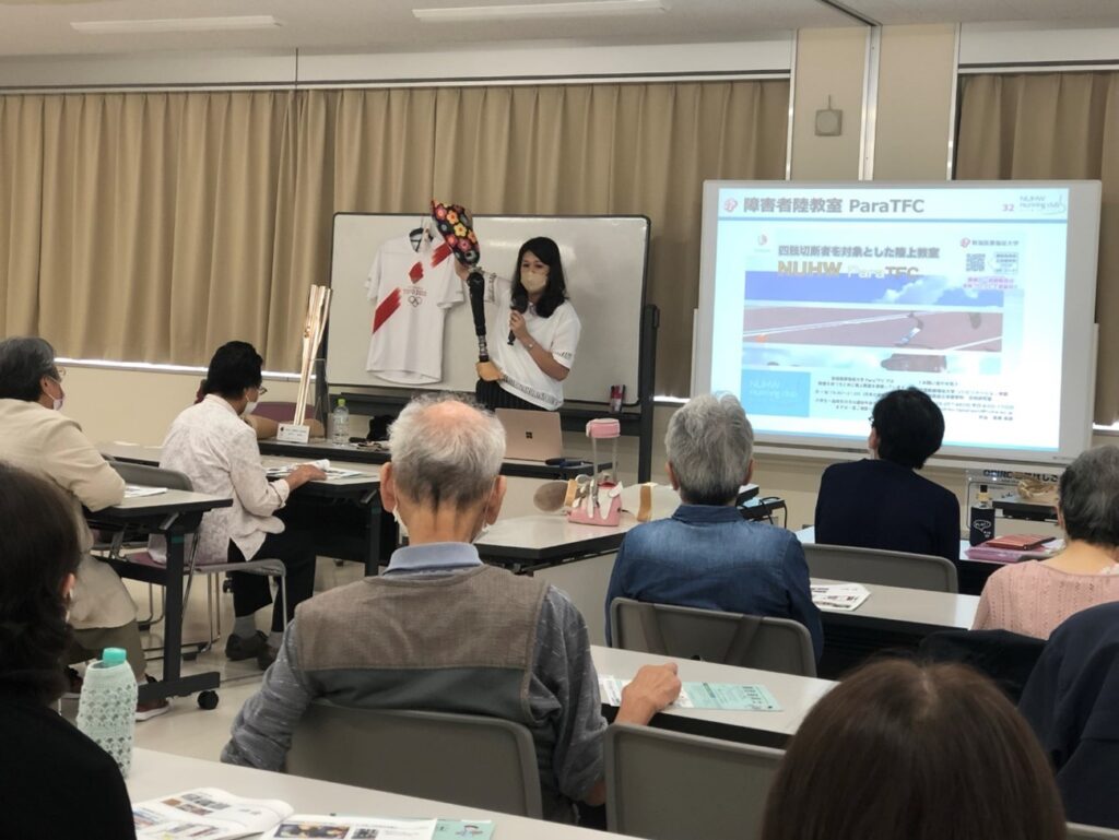今回の講師は、義肢装具自立支援学科の佐藤未希先生にお願いし、「障害者陸上教室 ParaTFC」と題したお話しをしていただきました。今回の講座には34名の方が受講されました。会場は満員で、講座は2部構成で進行されました。