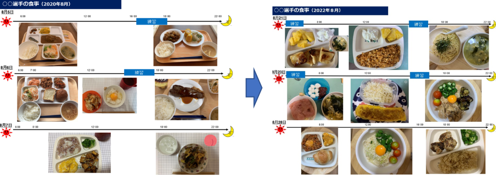 それから2年間食事サポートを続けていった結果、「食事に対して興味を持ち、楽しみながら食事を用意できている」「パフォーマンスと食事を照らし合わせて考え、欠食は全くなくなった」「体重をみながら糖質摂取量も調整しようと意識できている」という変化があり、身体の調子が整うだけでなく、心理的なストレスも軽減され、継続的にトレーニングに臨めるようになりました。