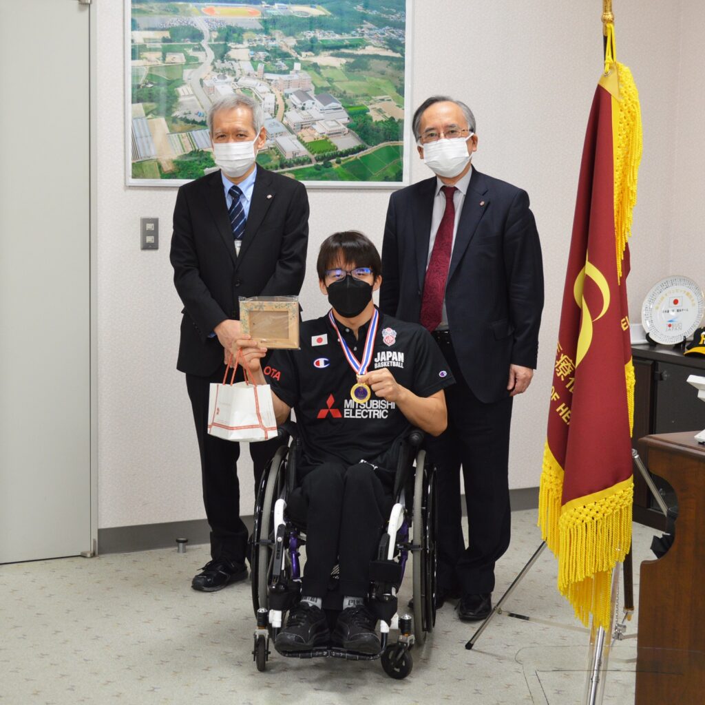 知野光希さん(医療情報管理学科3年)がIWBF 男子 U23 車いすバスケットボール世界選手権大会の優勝報告のため、学長を訪問しました!