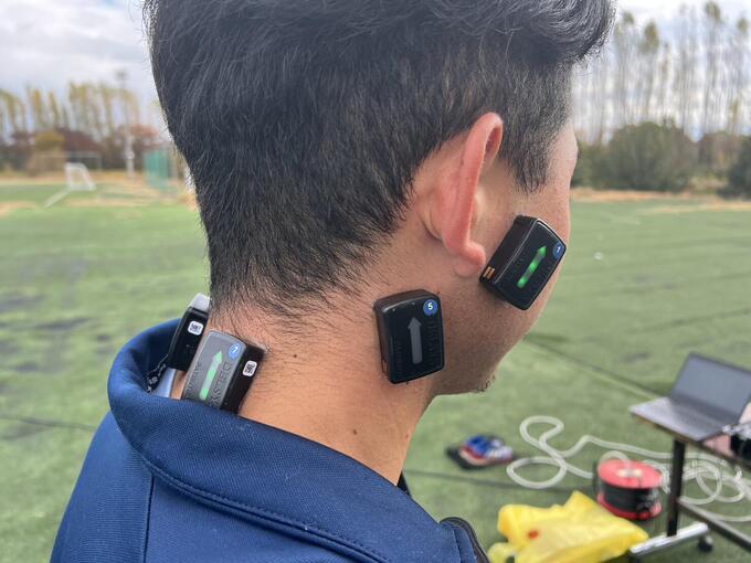 咀嚼筋,頚部,下肢にワイヤレス筋電を貼付して,咬合強度に伴った各筋肉の筋活動を解析することで,咬合が及ぼす遠隔促通効果(噛みしめることで他の筋肉が活性される効果)が分かり,咬合によるシュートやヘディングのパフォーマンスの影響について選手にフィードバックし,今後の運動パフォーマンス向上に役立てます.また,頭部に加速度センサーを装着して咬合によるヘディング時の頚部の固定性や頭部への衝撃を解析し,ヘディングパフォーマンスと脳振盪のリスクについて検討できます.