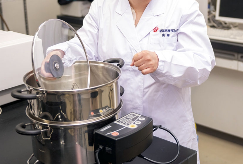 これまで行ってきた研究は大きく2つ。ひとつ目は低温スチーミング調理。食肉の中で硬くて利用がされにくい部位を低温で蒸したり、マイタケのたんぱく質分解酵素を利用したり牛肉の軟化の研究を行ってきました。ふたつ目は新潟市北区の遊休農地再生利用事業と特産物づくり事業に関連し、地域貢献を目的として研究を重ねてきた「シルクスイート」という品種のさつまいもについての研究です。研究を開始した2012年頃は「シルクスイート」は比較的新しい品種で、成分等に関する学術的な報告が少なかったこと。また、食品の成分は品種や土壌などの栽培条件により左右されることから、北区で栽培した「シルクスイート」の成分量やその調理特性についての研究を行いました。