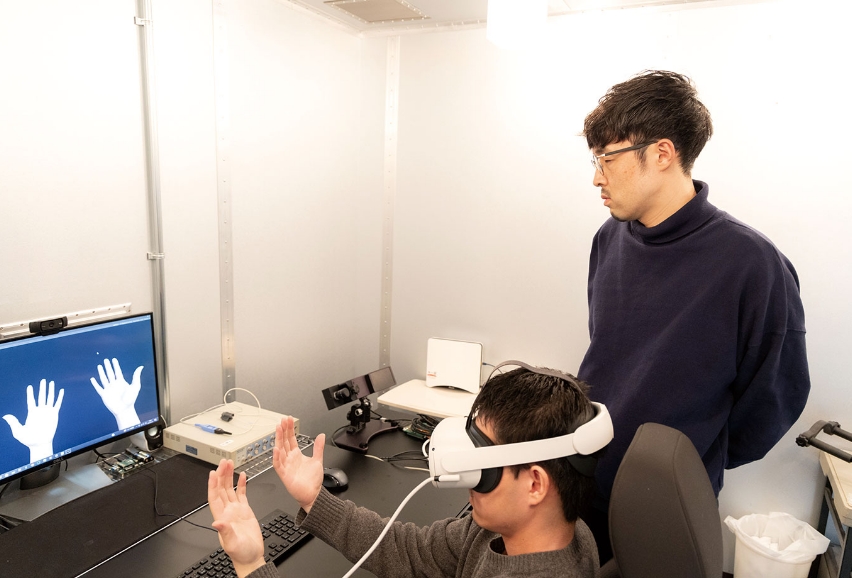大学時代は医学部保健学科に所属し、理学療法を専攻。実習で病院を訪れた際、脳卒中の後遺症で手足に激しい痛みを抱え、身動きがとれない患者さんに出会いました。その痛みは、手術の対象でもなく、投薬によっても効果が得られず、患者さんは「いつ治るのかわからない」という不安の中で苦しむ毎日。なぜこのような痛みが起きるのかを解明したいと思い、痛みと脳をテーマに研究することを決意しました。実はその患者さんのように、外傷もなく、レントゲンやMRIでも異常が見つからないのに長年激痛に悩むケースは少なくありません。また、痛みがあまりに強いと、その部位を自分の体の一部として認識できなくなることがあります。例えば手が痛い場合、目を閉じると自分の手がどこにあるのかわからなくなってしまうのです。原因が分からなければ治療法も見つからず、治療期間の見通しも立たない。そもそも治るかどうかもわからない状況は、想像を絶する辛さだと思います。こうした症例に対する治療法は、現在も世界中の研究者によって模索されており、私も解決策を見つけたいと考えていました。その中で出会ったのが「VR(仮想現実)技術」と「脳刺激技術」です。