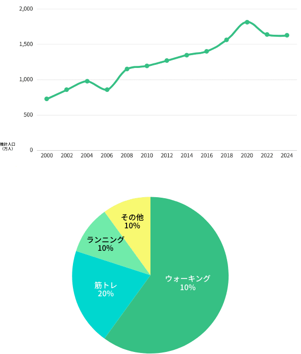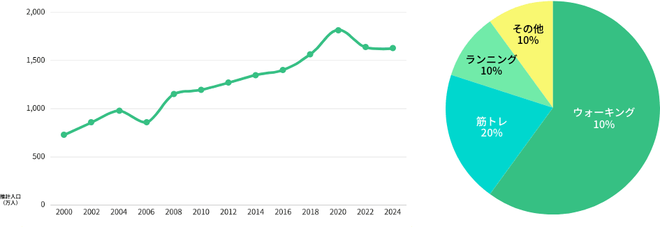 筋トレ人口の増加推移・運動種目別人口(※割合イメージ)