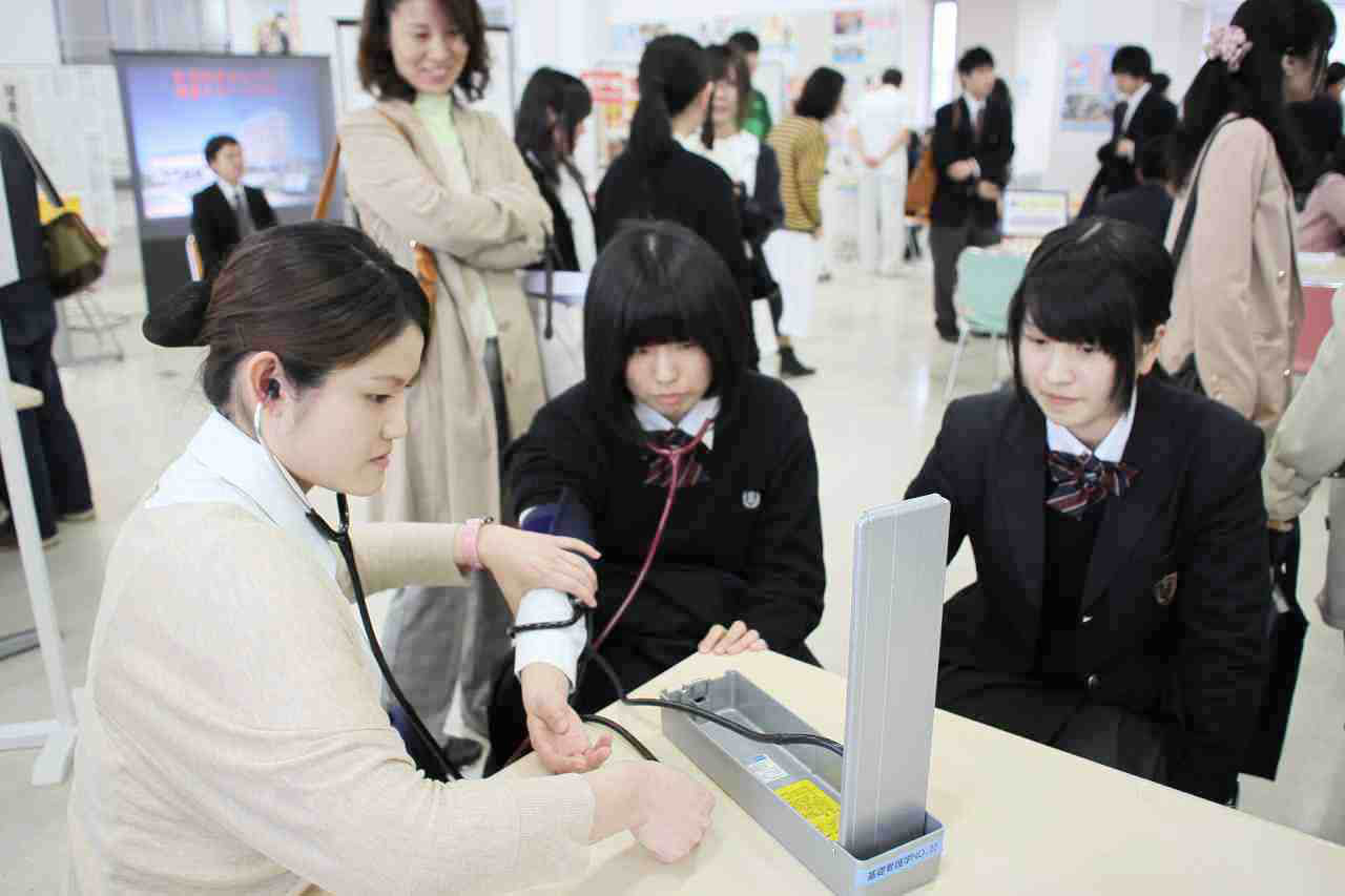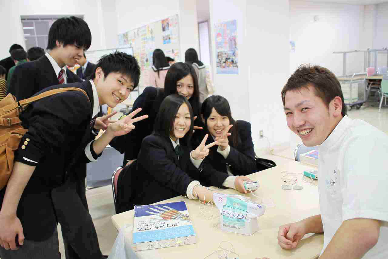 こちらは、理学療法学科の施設見学★実際に使う実験器具を試しています
