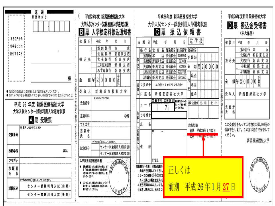 平成26年度 「センター試験利用入(前期日程)」の出願に際し、入学検定料(受験料)の振込時に必要となる【新潟医療福祉大学 大学入試センター試験利用入学選考試験 振込依頼書(C票)】について、