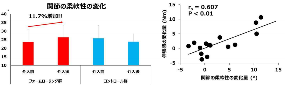 5週間のフォームローリング介入により関節可動域が11.7%増加し、そのメカニズムとしては伸張感に対する慣れの変化が関連していることを明らかにしました。