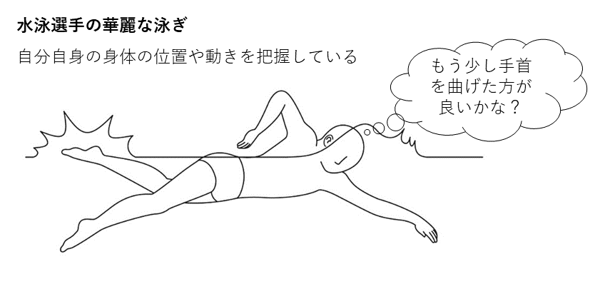 わたしたちの研究グループでは、「人はなぜ泳げるのか?泳げるようになるとはどういうことか?」という疑問を明らかにするため、研究を進めてきました.そんな中、今回の研究では、泳げる人(水泳選手)は、水の中でも陸上と同じように自分自身の身体の位置を理解できており(身体位置覚)、そのことが「華麗な泳ぎ」を生み出していることが分かりました.