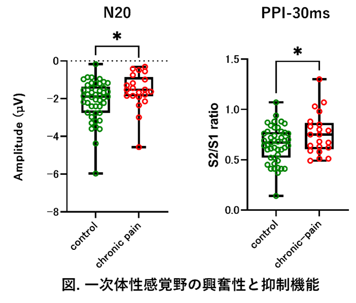 本研究では、医師に治癒したと診断されてからも持続する痛みを抱えるアスリートに対して脳波を用いてS1の体性感覚誘発電位(SEPs)と皮質内二連発抑制(PPS)を評価しました。その結果、慢性疼痛をもつアスリートでは、慢性疼痛をもたないアスリートと比べてS1の興奮性(N20)と抑制機能(PPI-30ms)が減弱することが明らかになりました(図)。
