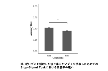 昨年度の卒業論文で木戸浦さんと樋口さんは、抑制制御に関わる認知課題としてStop-Signal taskを選択し、そのStop-Signal Taskを自分たちでプログラミングしました。その上で、比較的硬いグミと柔らかいグミを咀嚼した直後のStop Signal Taskにおける成績について比較しました。その結果、硬いグミを咀嚼した場合、比較的柔らかいグミを咀嚼した場合と比べStop Signal Taskの成績が有意に向上しました。