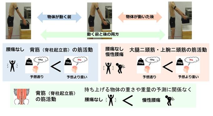 本研究の結果から,慢性腰痛がある人とない人では,予想よりも重い物を持った際の筋のリクルートメントが異なることが明らかとなりました.また,慢性腰痛がある人は,持ち上げ動作で背筋の過活動が生じていました。