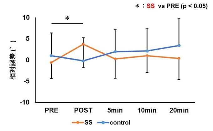 1. 関節位置覚の精度の指標である相対誤差がSS直後で増大し、5分後には元に戻ることが明らかとなりました。