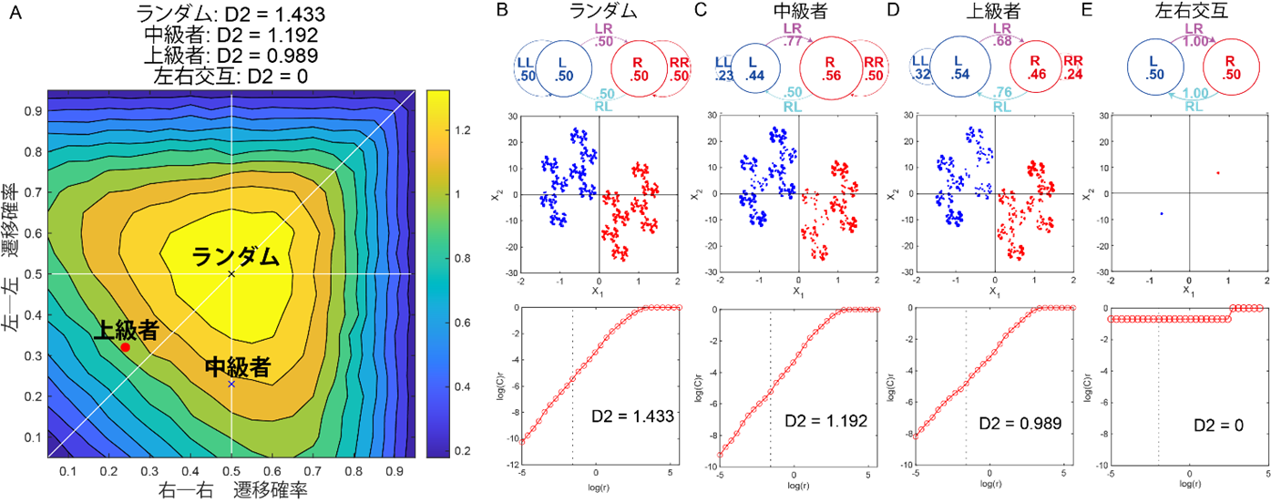 図3 Aはショット角度が右-右と移り変わる確率(横軸)と、左-左と移り変わる確率(縦軸)を変更しながら計算した相関次元。完全にランダムでは、図の中央(0.5-0.5)に来る。B-Eは4つの遷移確率(上段)におけるポアンカレ断面(図2D)のフラクタル図形(中段)と相関次元(下段)