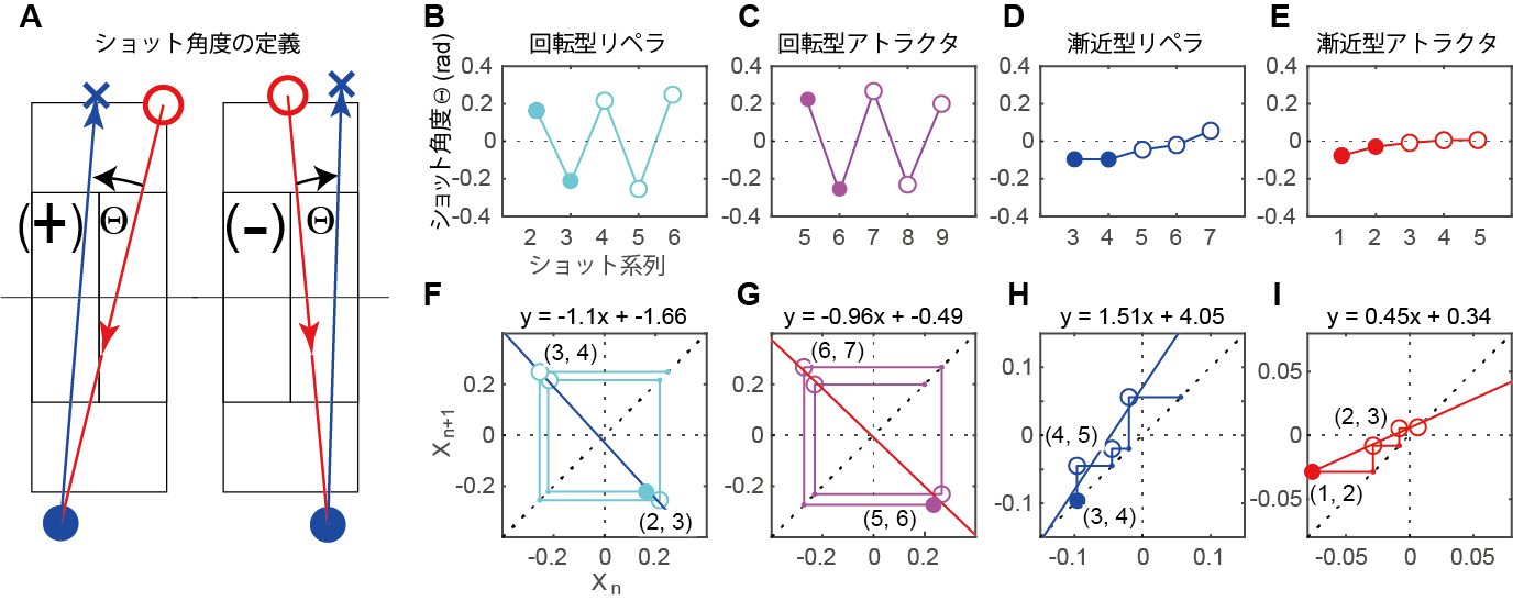 図1 典型的な打球コースの規則性。Aがショット角度の定義。上段(B-E)が打球コースの時系列。下段(F-I)がリターンマップ分析。Fの縦軸と横軸に、Bのショット系列2と3の角度と3と4の角度をそれぞれ異なる2点として、その2点を線で結びました。同じように、C、D、EからG、H、Iを書きました。これらの図から時系列をFからIまでの4つの規則性に分類することができます。