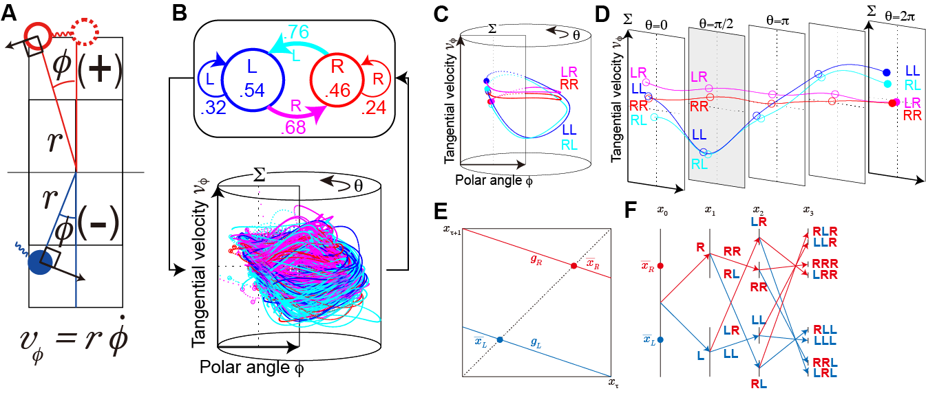 図2 Aはコート上の動きの定義で、極座標系でのコート上の位置(角度)とその接線方向の速度で表しています。Bはショット角度(L:左かR:右)が移り変わる確率(遷移確率:上)と、そうして打球コースが移り変わったときのコート上の動き(打球コースに対する動きの時間変化:下)。C、Dは移り変わりの4パタン(LからR、RからR、LからL、RからL)ごとに平均した軌道。Eは回転のあるカントール集合の2つの関数(左右)で、Fがその時間発展。X2のところがデータ(θ=π/2のグレーの面)と順番が一致しています。