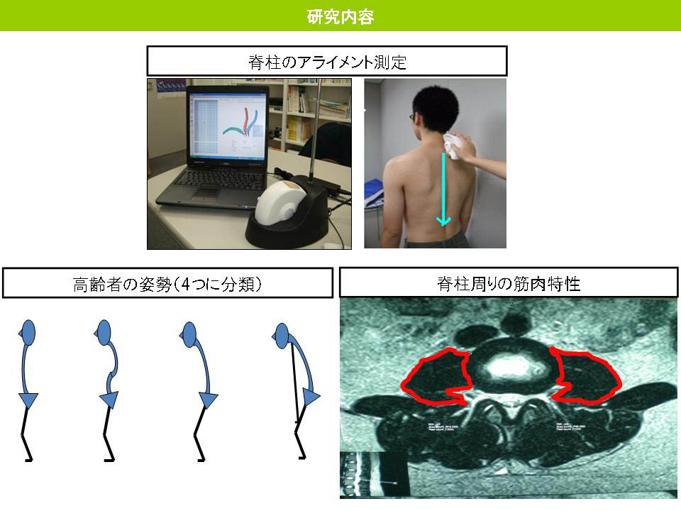 専門は「①腰痛の理学療法」と「②筋肉を調整する徒手的治療(マイオチューニングアプローチ)」です。①は加齢に伴う姿勢や筋肉の変化を調査しながら、腰痛との関連を研究しています。さらにどんな治療や運動が腰痛に良いのかを実際の患者さんを通じて調べています。②は筋肉が原因でおこる痛みやしびれを、徒手によって調整していく研究です。