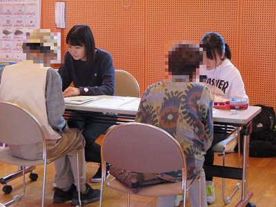 参加者に対して握力測定の結果を説明している 理学療法学科学生