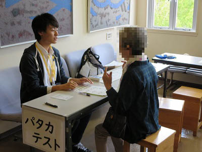 参加者に対して口腔機能に関する測定の結果を説明している 医療情報学科学生