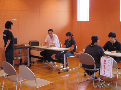 参加者に対して下肢筋力測定の結果を説明している 健康スポーツ学科学生