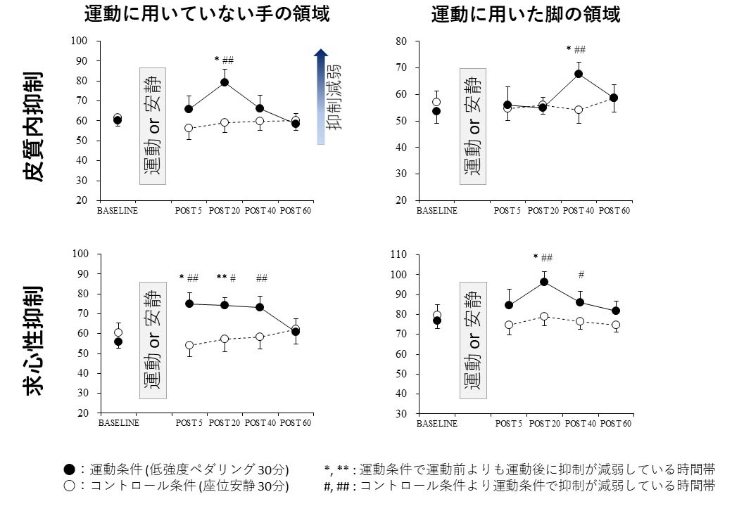 2. 運動に用いた脚の領域だけでなく運動に用いていない手の領域でも、一次運動野の脳活動、特に抑制系の働きの指標である皮質内抑制と求心性抑制が一時的に減弱することがわかりました。