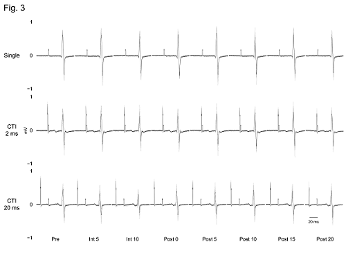 各刺激条件の生波形を示し、CTI 2 msがIa相反抑制、CTI 20 msがD1抑制であり、補足運動野の脳刺激介入前から介入後20分間を計測した。