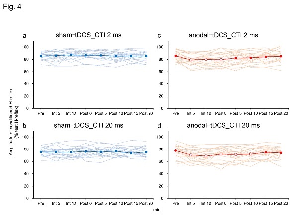 Fig. a, b:補足運動野に偽刺激際の結果.Fig. c:補足運動野に陽極tDCSを介入した際のIa相反抑制の結果で,介入中から介入直後まで抑制が増強した.Fig. d:補足運動野に陽極tDCSを介入した際のD1抑制の結果で、介入中から介入後10分間抑制が増強された。
