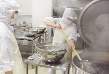 大規模な給食施設には、給食管理者として管理栄養士または栄養士が配属されます。この実習室では、給食施設における栄養管理、作業管理、食材管理、衛生・安全管理、栄養教育、喫食者サービスおよび大量調理等の実践的な手法について学びます。調理室の他、下処理室や食器洗浄室を完備し、また衛生管理の面から、それらの作業は全て異なる部屋行われるように設置されています。
