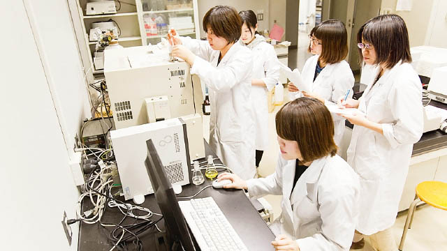 食品には脂質やカルシウムなど栄養成分はもちろんのこと大豆のイソフラボン、トマトのリコペンなど様々な成分が含まれています。本学の精密機器室にはこのような成分を分析できる高速液体クロマトグラフ(HPLC)やガスマトグラフ質量分析計(GC‐MS)、原子吸光光度計といった機器類が充実しています。食品学実験では学生一人ひとりがこれらの機器類を使って食品中にどんな成分がどれくらい含まれているかを分析します。例えばHPLCや分光光度計を使ってニンジンやトマトのカロテノイドを、原子吸光光度計を使ってレバーの鉄を、GC-MSを使ってDHAなどの魚の脂肪酸を測定しています。