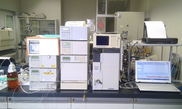 多成分混合物を分離分析するクロマトグラフの一種です。溶媒に溶解した他成分混合物を、液体の移動相とともにポンプで加圧送液してカラム充填剤(固定相)を通過させ、固定相と移動相の相互作用(吸着、分配、イオン交換、サイズ排除など)の差を利用して迅速に分離し、このときの溶出時間や溶出面積により目的成分の定性や定量を行います。食品関係では糖やビタミン、カロテノイド色素などの様々な有機化合物の定性・定量に用いられています。