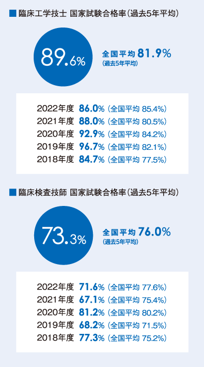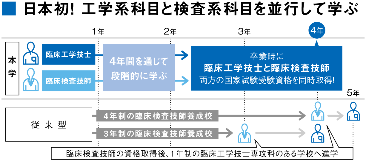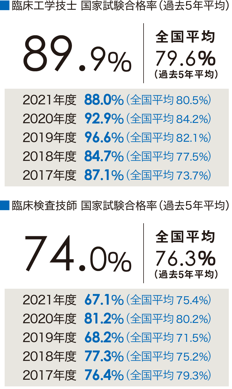 | 臨床検査技師(国家資格) | 主に病院等の医療機関において、患者様から採取した血液や尿を検査する「検体検査」、身体に検査装置を装着して心電図や脳波などを検査する「生理学的検査」など、さまざまな検査業務を行います。これらの検査結果は、病気の予防や発見、治療方針の決定、治療効果の測定など、治療に直接関わる重要なデータとなるため、「チーム医療」の一員としてその活躍がますます求められています。また近年では、最新の検査機器を用いた遺伝子検査や移植治療の検査も行うなど、高度な検査技術に加え、検査機器に関する知識を有した人材が求められています。 |