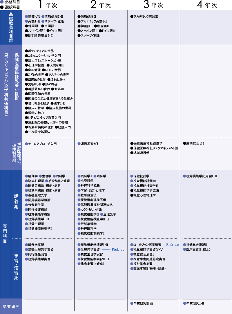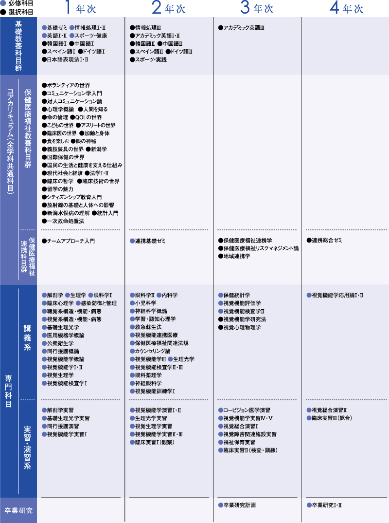 基礎教養・保健医療福祉教養科目を中心に学びます。視能訓練士国家資格取得を目指して基礎的医学知識としての解剖学や生理学を学び、専門基礎科目として眼科学・視覚機能学・視覚生理学、同行援護従業者に向けたロービジョン医学などを学びます。