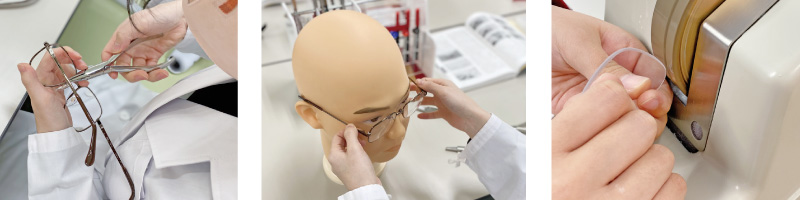 適切な眼鏡度数を選定することは視能訓練士の主要な業務の一つですが、実際に眼鏡を作るのは眼鏡作製技能士です。この実習は、実際にレンズを加工してフレームに枠入れし、顔に合わせてフィッティング調整するという、眼鏡分野の仕事を体験するもので、他の養成校ではほとんど実施できていない内容です。具体的には、自分の顔に合ったフレームを選定し、レンズを自動加工機にかけて枠入れ加工した後、できあがった眼鏡のかけ具合を調整します。レンズ度数の決定だけでなく、眼鏡加工からフィッティングに至る一連の流れを体験しながら学べるユニークな実習です。